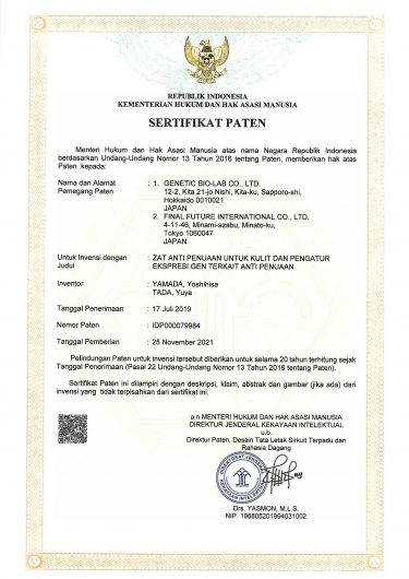 We have discovered that the mixture of “special low-molecular weight DNA” and “soybean extracts (F polyamine)” has a synergistic effect in anti-aging of skin and adjusting expression of anti-aging-related genes.